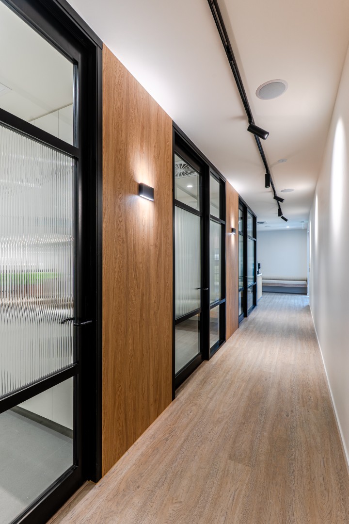 A contemporary clinic shaped through soft curves, warm timber accents, and refined glazing details. This healthcare environment was designed to balance clinical precision with a sense of calm, using joinery and materiality to create flow between reception, treatment, and waiting areas. Each space prioritises both function and atmosphere ensuring patients feel at ease while staff benefit from an efficient, carefully planned workspace.